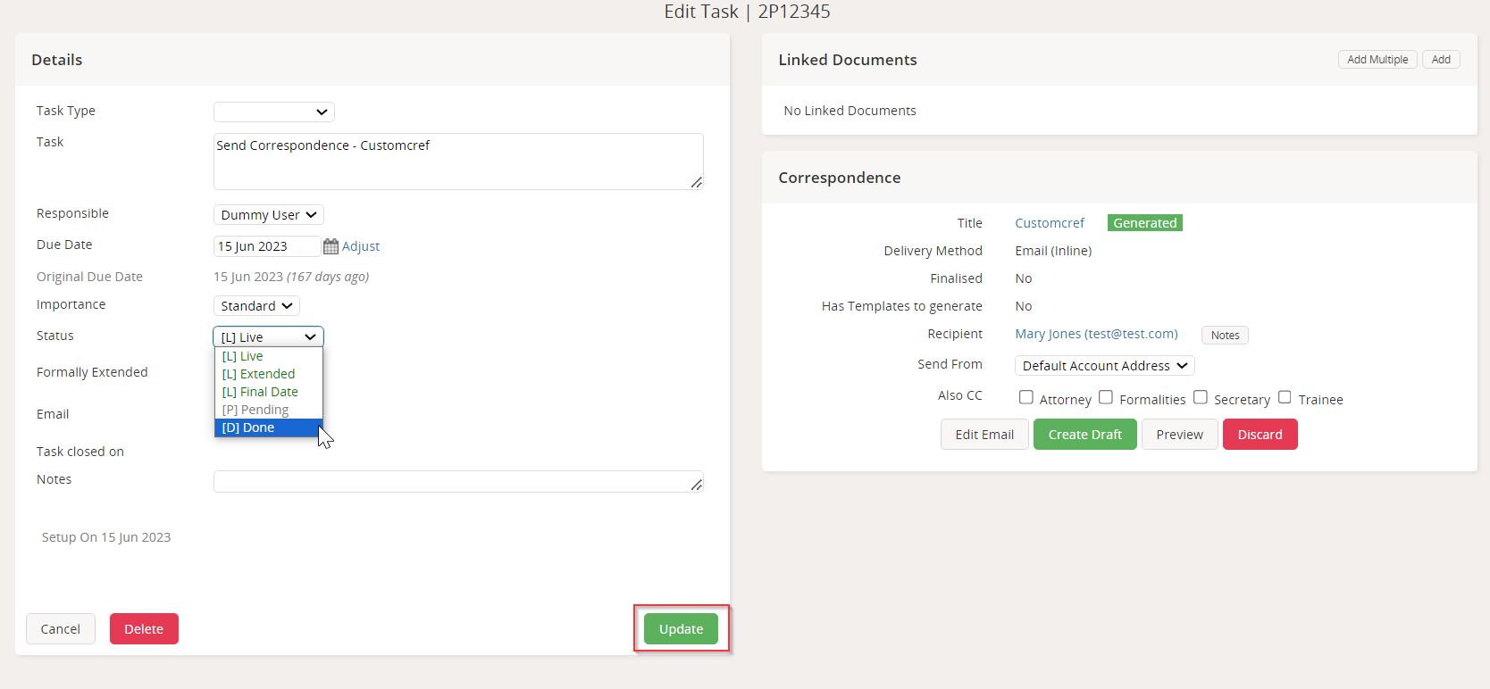 The change will be saved automatically. Equinox will confirm the change by displaying a 'Task Updated' message in the bottom right corner of the screen.
