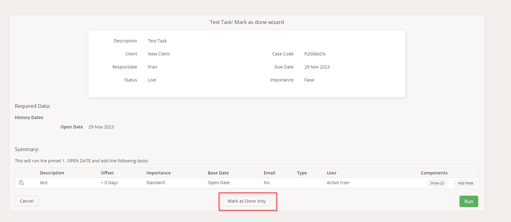 When you mark a task as Done, the Mark as done wizard will trigger any associated pre-set components. If you want users to have the option to mark tasks as Done without running components, you can turn on a setting to allow this. To do this: