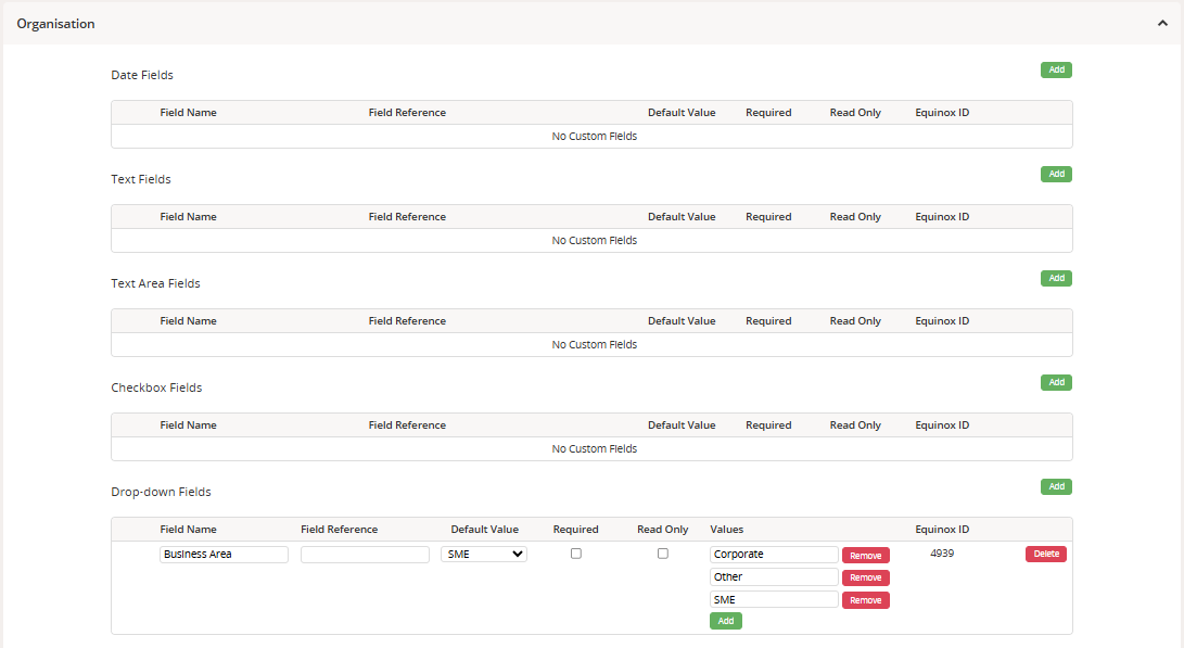 | Delete a Custom Field | Click the 'Delete' button on the right of the field name Note: Deleting a field will remove it from your system immediately. Please check that there's no required data in this field before it's deleted as this action isn't reversible. Please contact our support team before deleting a field if you're unsure. |