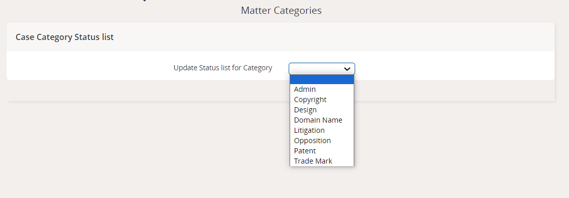 In this case we want to update the status list for trade marks, so we'll select 'Trade Mark' from the dropdown.