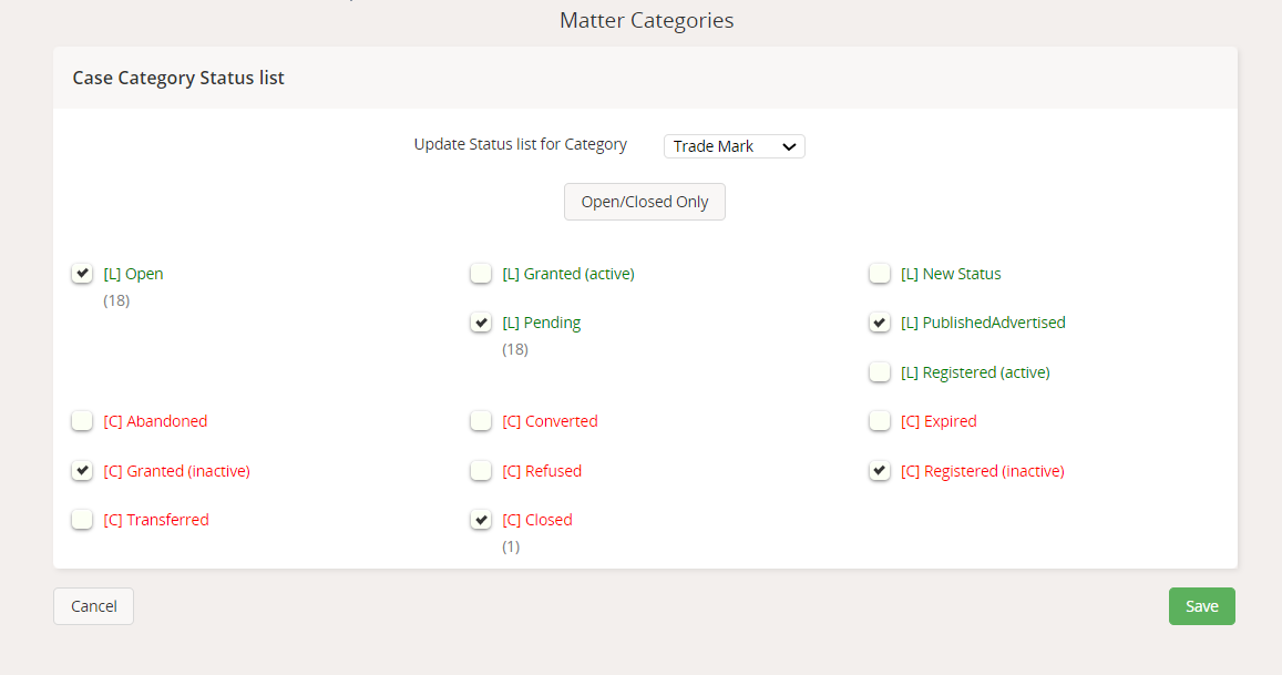 This opens a list where you can tick boxes next to different open ([L]) or closed ([C]) status settings to apply them to this case category.